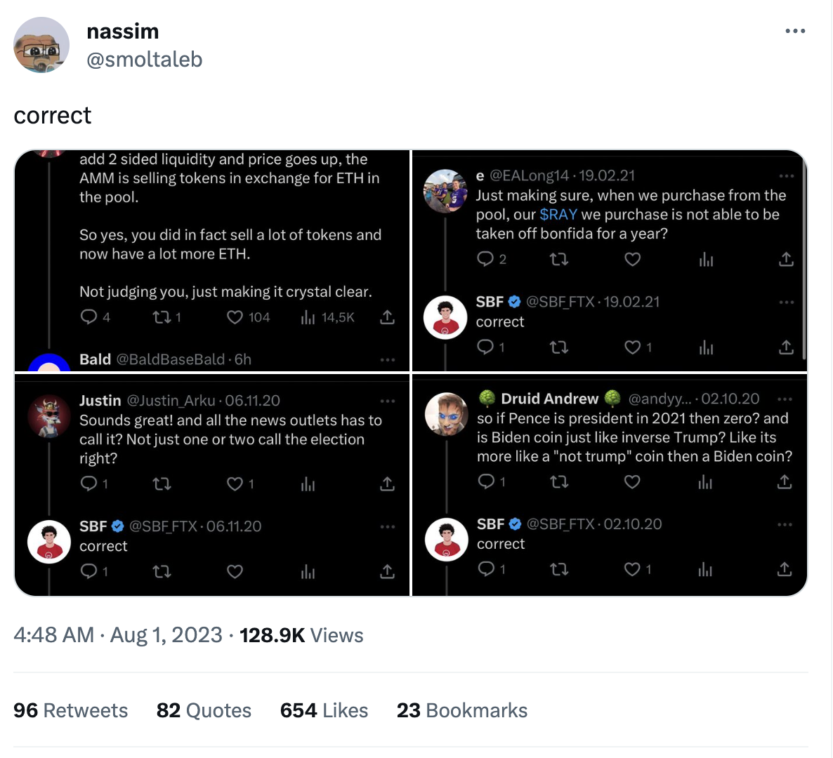 「correct」,一個平平無奇的日常用語,曾反復多次出現在 SBF 的推特回復中,在推特號@smoltaleb 羅列出的一系列截圖中,我們發現,SBF 曾在多次一系列推文回復中用到了「correct」這個詞。