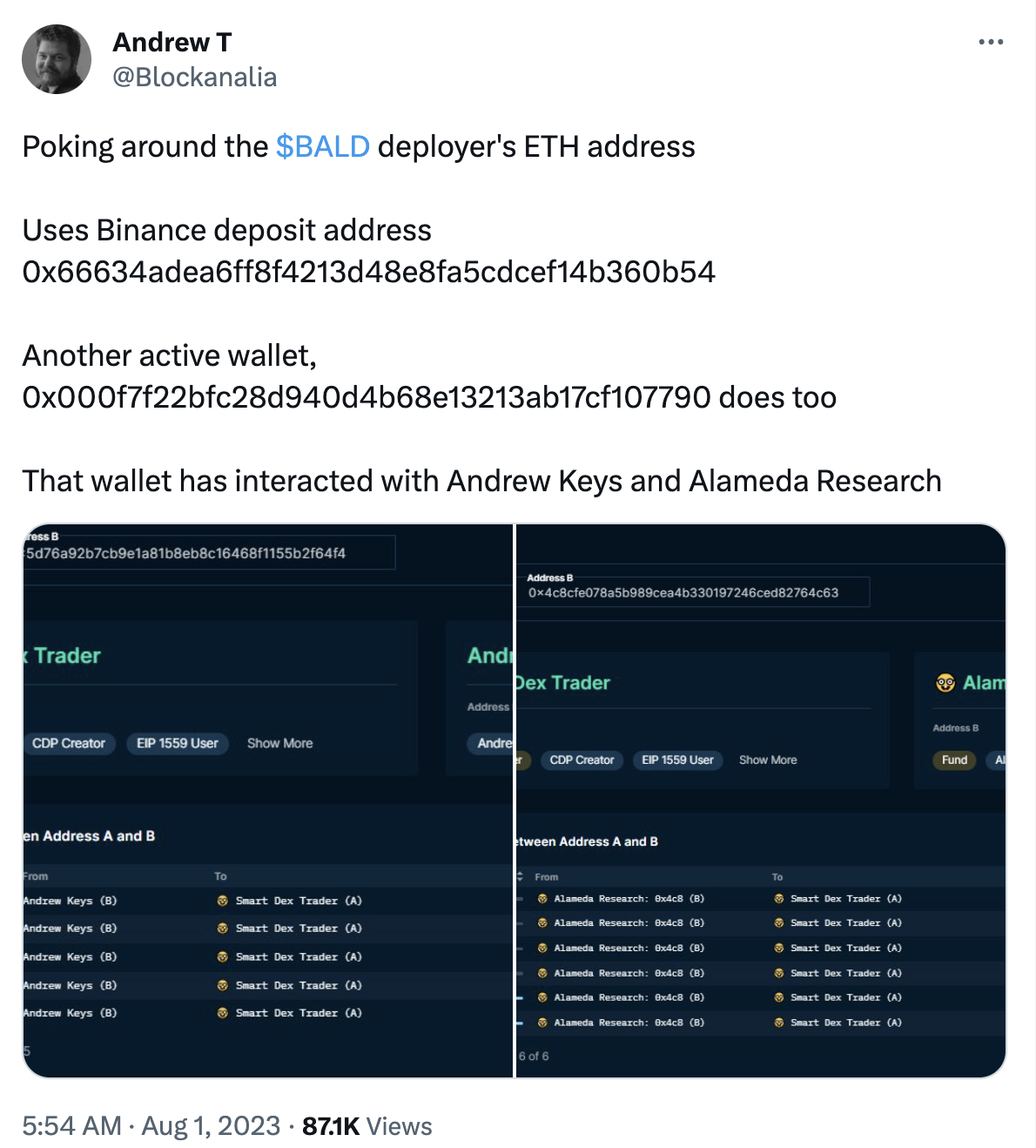 而根據推特上多位加密 KOL 推測的一致線索,$BALD 部署者鏈上活動與 SBF 有千絲萬縷的聯系,這包括: