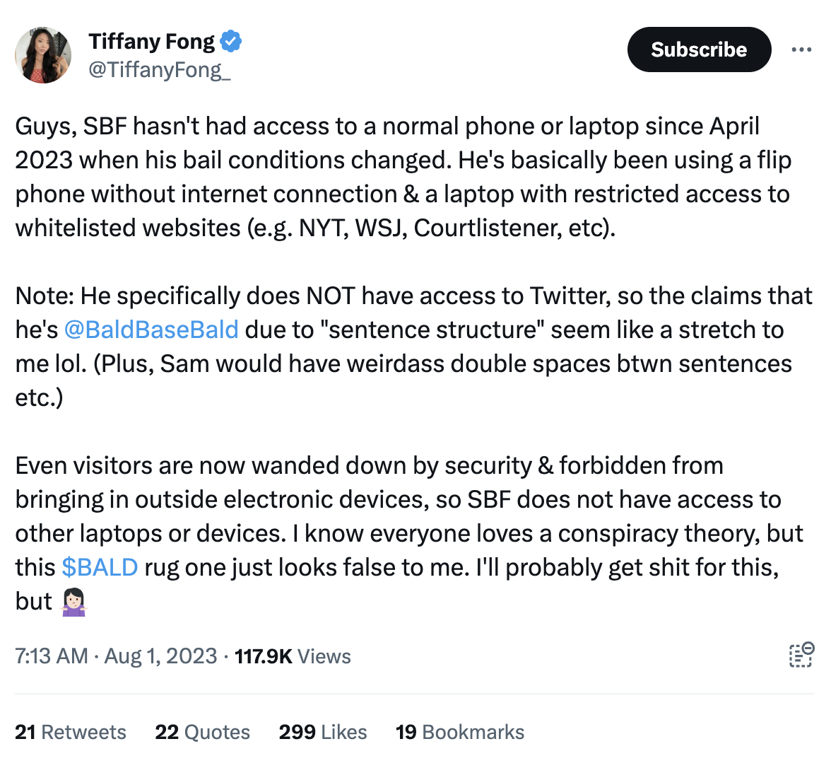 注意:他無法訪問 Twitter,因此聲稱他是不太可能。而且 Sam 喜歡在句子之間打出雙空格等的習慣。現在,即使是訪客也會受到安全檢查并被禁止攜帶外部電子設備,因此 SBF 無法訪問其他筆記本電腦或設備。我知道每個人都喜歡陰謀論,但這次說 SBF 就是背后$BALD 主導者看起來很假。」