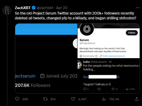 而鏈上偵探 ZachXBT 曾于今天 4 月發布推文稱,「Serum 推特已經刪除了所有推文,并將頭像改成了 Milady,然后開始奶屎幣。」這真的是巧合嗎?