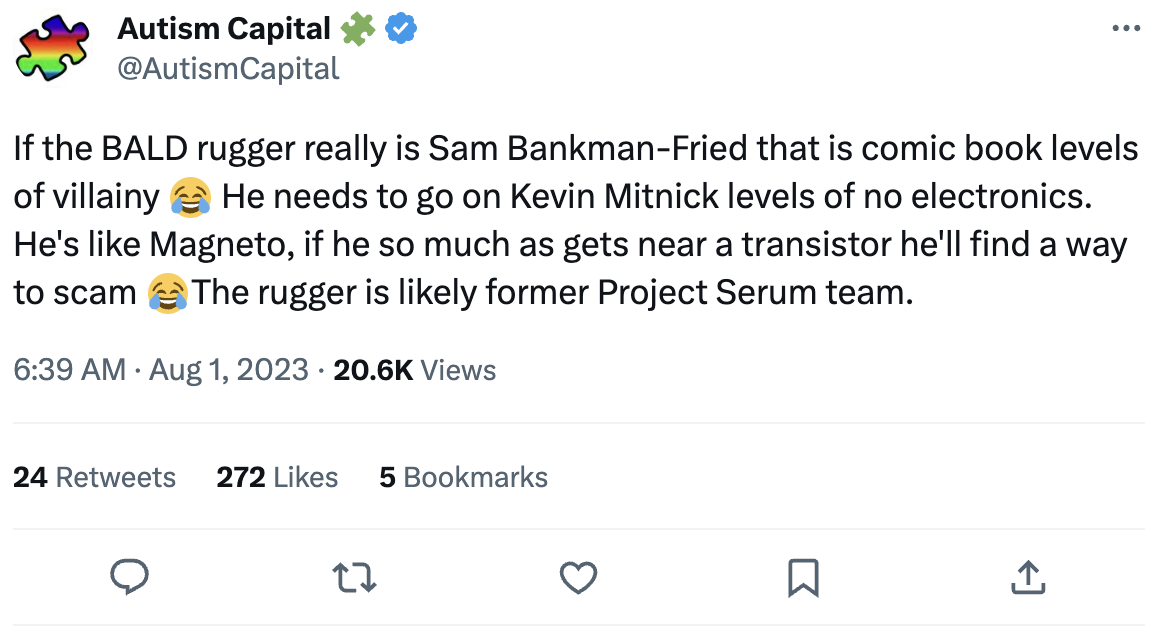 Autism Capital 發布推文回復:如果 BALD rugger 真是 Sam Bankman-Fried,那真是漫畫書中反派角色般的邪惡。.. 他總能找到一種方法詐騙。Autism Capital 認為 BALD rugger 可能是前 Serum 團隊的成員。