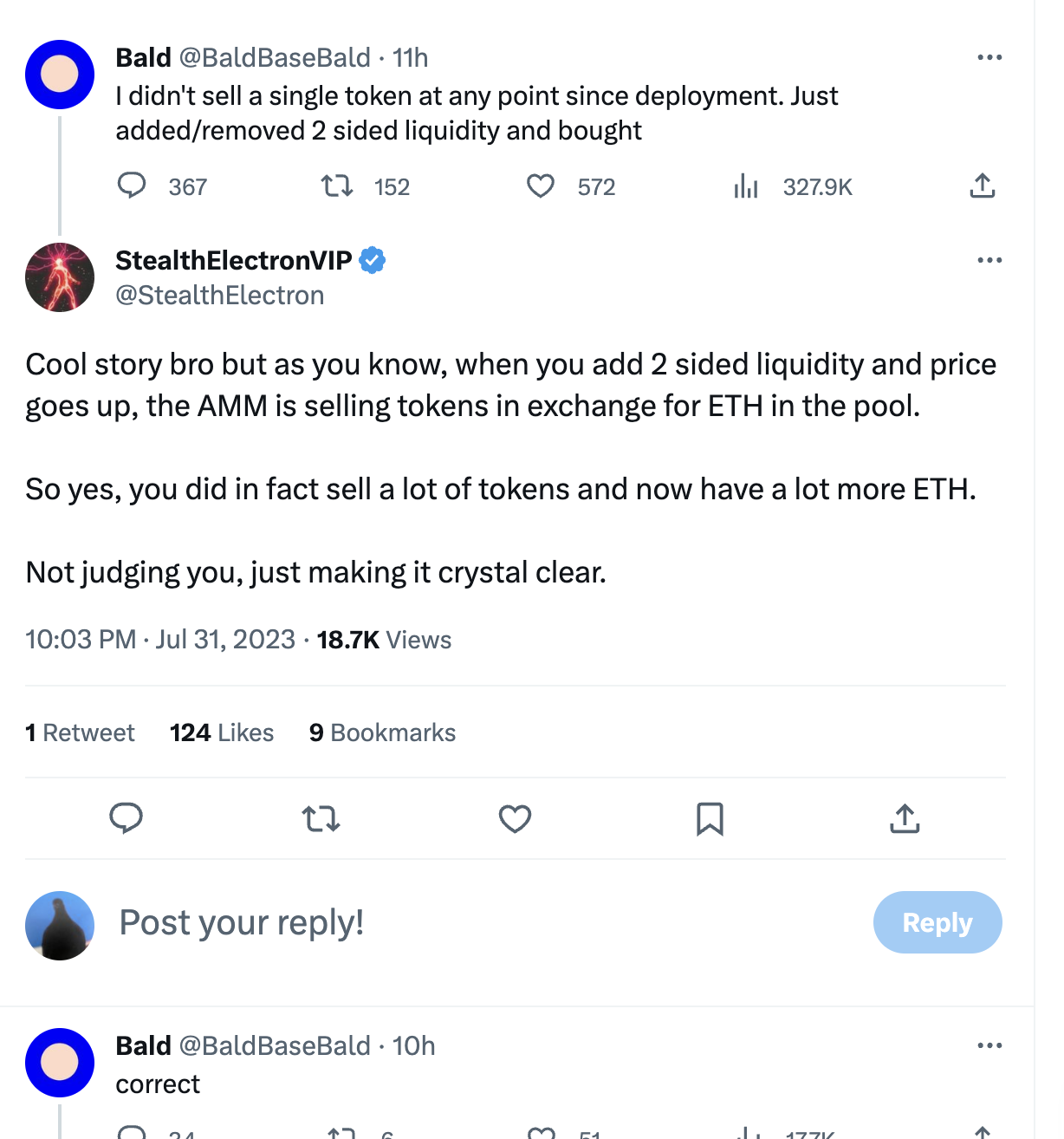 接著 @StealthElectron 推特號對上述推文進行了回復稱,「很酷的故事,兄弟,但正如你所知,當你添加雙邊流動性并且價格上漲時,AMM 會出售Token以換取池中的 ETH。所以,是的,你實際上出售了很多Token,現在擁有了更多的 ETH。沒有評判你,只是把事情說清楚。」