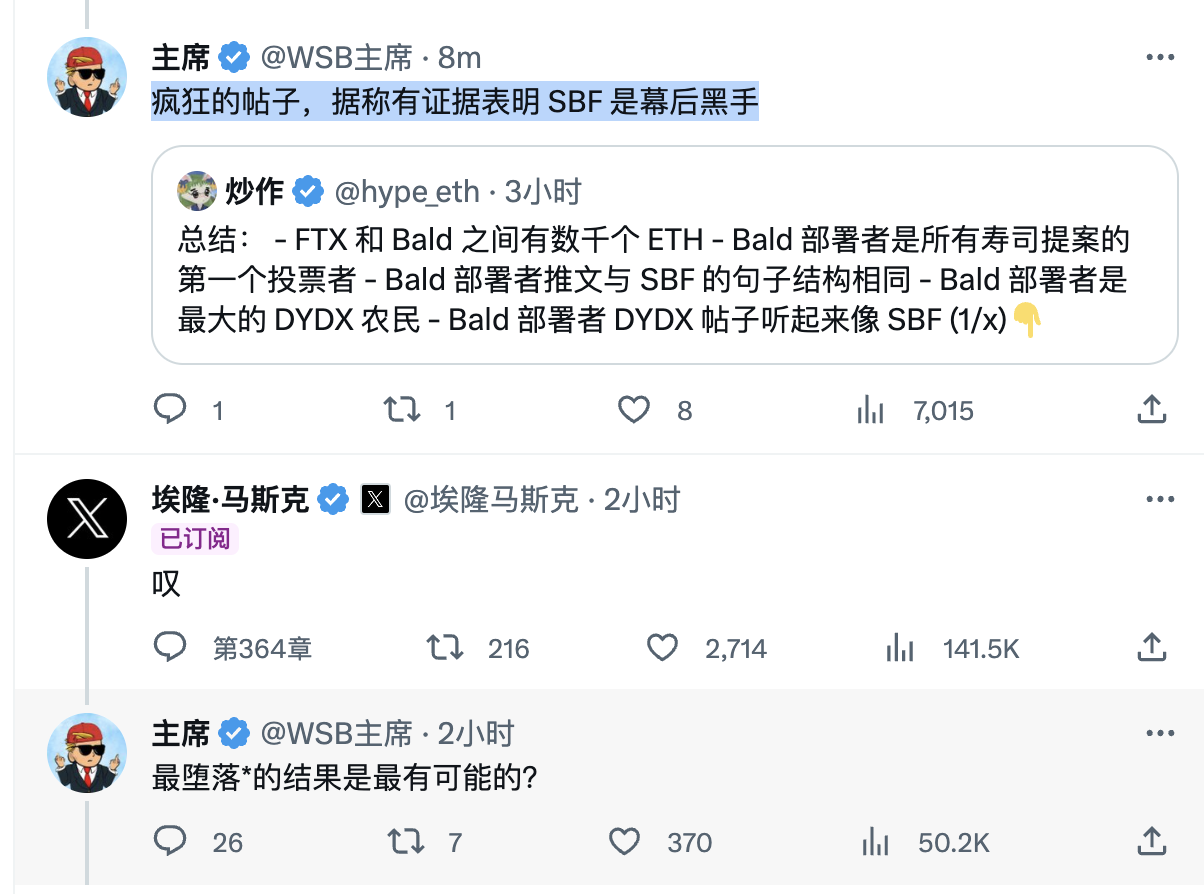 加密貨幣 KOL@WSBChairman 在社交媒體上揭露 SBF 有可能是 BALD 背后黑手。根據該推文,WSBChairman 表示「SBF 今天早上被軟禁在父母的地下室里,卻被指控創造并詐騙了市值 1 億美元的垃圾幣。這種事你連編都編不出來。」而隨手馬斯克發布「sigh」回復該推文。