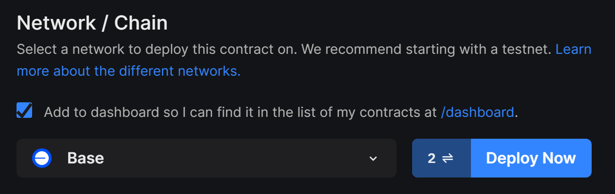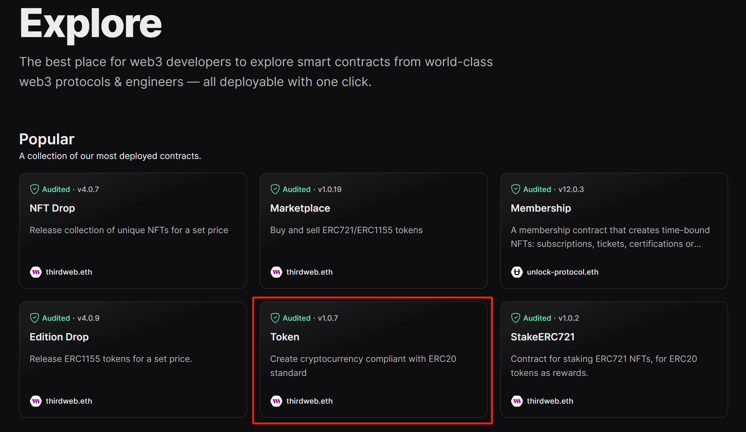 接著我們可以選擇要部署的合約類型。這里可供選擇的類型很多,無代碼一鍵部署 ERC-20、ERC-721、ERC-1155 Token 都是支持的,甚至支持部署一個帶質押功能的 ERC-721 Token、可租借的 NFT ERC-4907 乃至像 OpenSea 那樣的交易市場等等。這里我只是簡單的部署一個 ERC-20 Token,所以選擇「Token」: