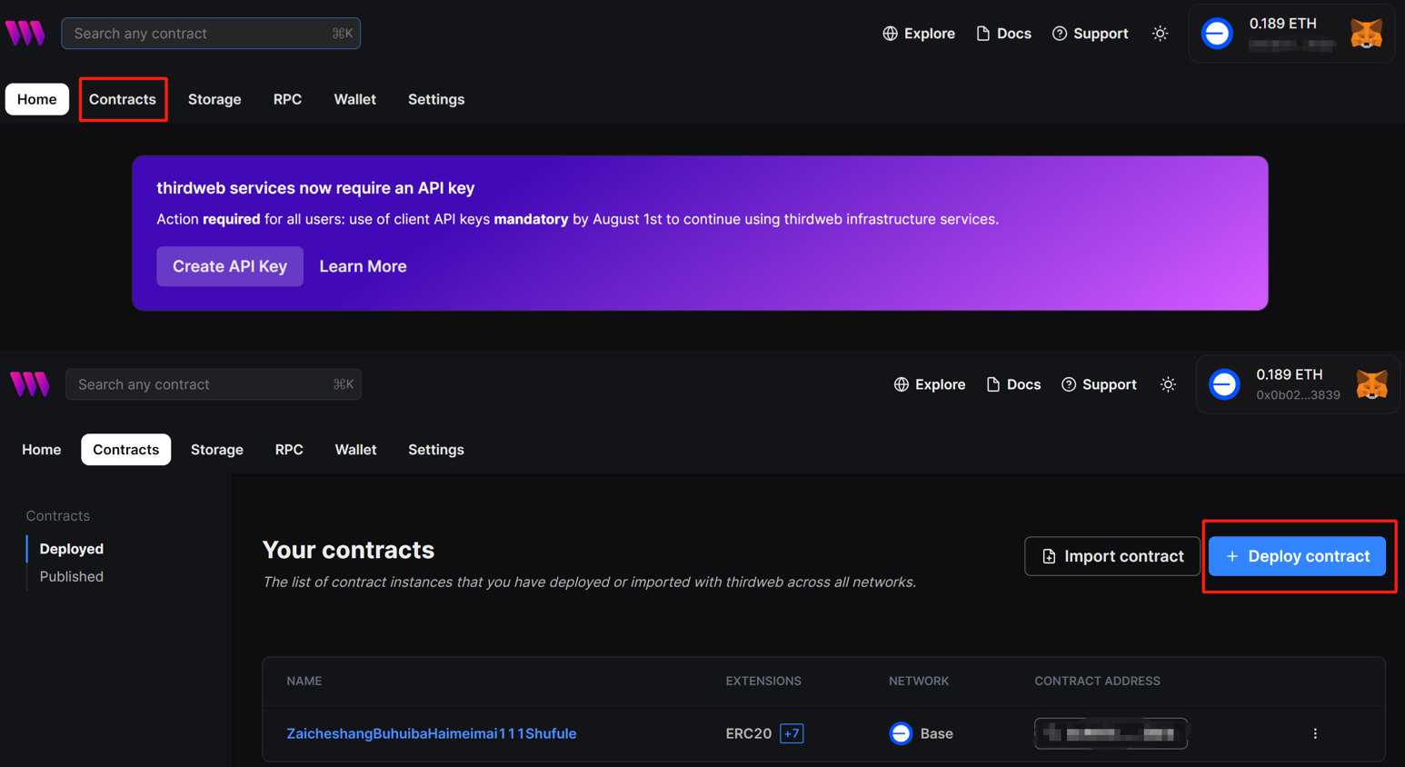 在 Thirdweb 上連接錢包并簽名后,點擊「Contracts」,再點擊「Deploy contract」。