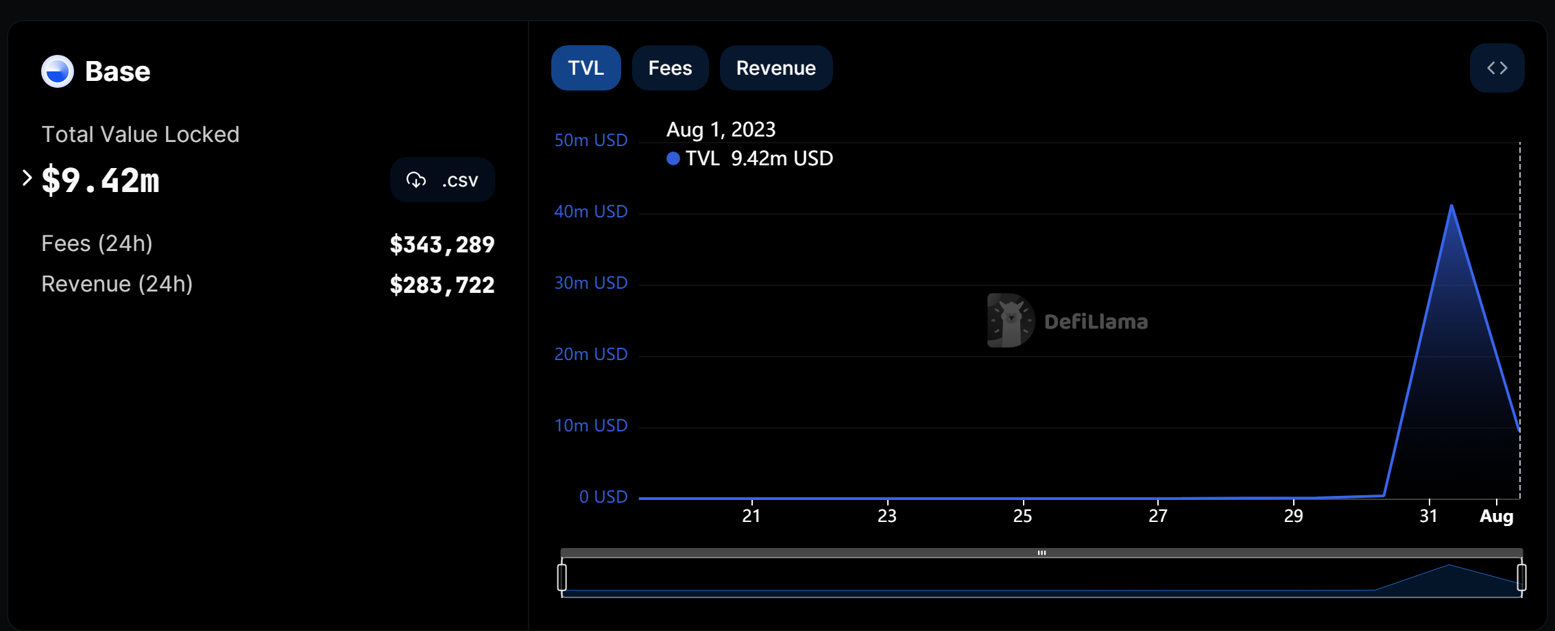 但是僅僅過了 3 個多小時,$BALD 就露出了獠牙將一切毀滅。項目方突然在 7 分鐘內撤走了總計 8660 枚 ETH 和 1.79 億枚 $BALD 的流動性,$BALD 的價格大幅下跌,最大跌幅曾達到 80%。目前,根據 dexscreener 上的數據,$BALD 的流動性資金池內僅剩 12 ETH,Base 網絡的 TVL 也受此影響一落千丈,從 4200 萬美元左右跌到了 942 萬美元。
