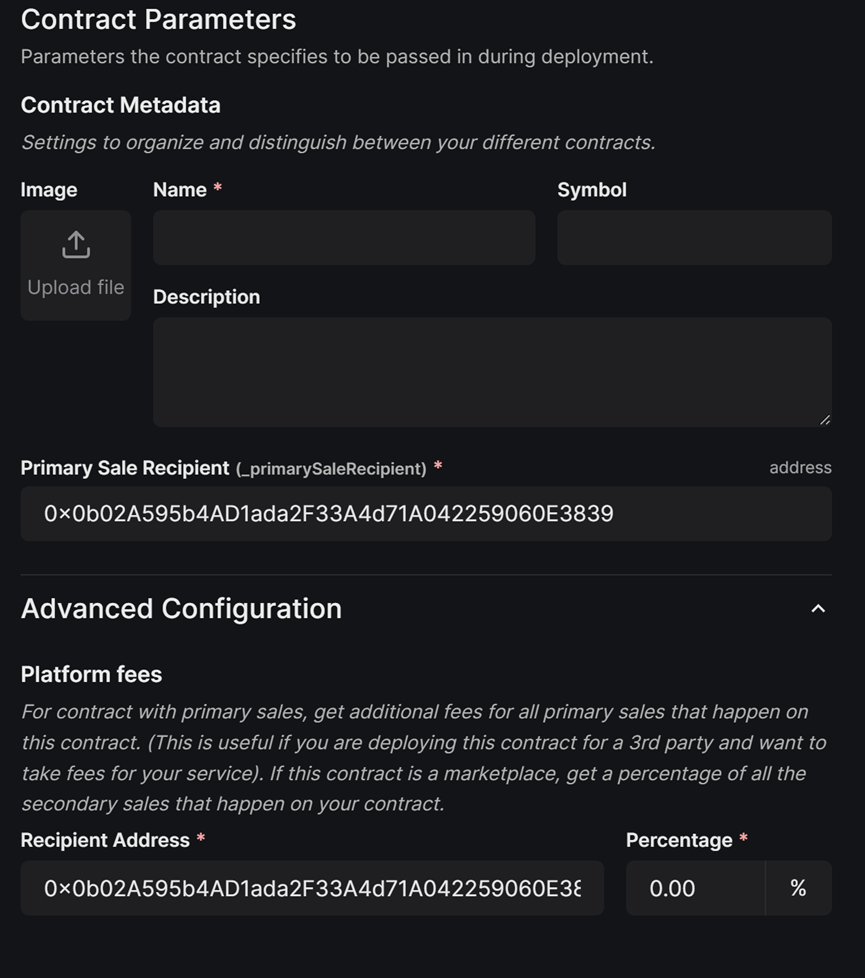 - Primary Sale Recipient:Token 預售的收入地址。由于我們選擇的「Token」合約是不帶預售價格的,這里其實也沒用。